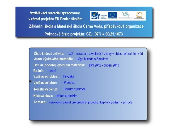 • • • • • • • Použité zdroje: http: //media. novinky. cz/445/294452 -top_foto 1 -g 7 wki. jpg? 1357300020 http: //www. vejnar. com/podzim 4/podzim 01. jpg http: //cms. tvujdum. cz/userdata/images/33391 vareni-a-stolvanirostilnysipekrecepty-foto-2. jpg http: //www. people. cz/mag/articles_photo/18033. jpg http: //zs 5 krnov. cz/skola/images/clanky/kastany/zaludy. jpg http: //bukvicky. wu. cz/bukvice. jpg http: //files. ovocezlutava. cz/system_preview_detail_200000037 -1 e 7481 f 6 cd/jablka%201. jpg http: //www. ireceptar. cz/res/data/070/008720. jpg http: //3. bp. blogspot. com/_P 4 qyk. DY 5 Hzo/TPi-a 9 PDiq. I/AAAAAEM/c. DQ 7 Dj. Vu. TKE/s 200/toptaste. jpg http: //www. kaloricketabulky. cz/fotografie-velka/769 effd 50 ea 0 c 318/jahody-zahradni. jpg http: //img 2. hyperinzerce. cz/x-cz/inz/8088852 -prodam-merunky-1. jpg http: //www. bedynkydomu. cz/fotky 10694/fotos/_vyr_111 meloun-vodni. jpg http: //www. nakupdomu. cz/editor/image/eshop_products/image_l_14734. jpg http: //sezonka. cz/wp-content/uploads/2012/05/Pixmac 000077689377. jpg http: //img. ella. centrum. cz/photos/2010/02/01/21 -204113 -celer. jpg http: //nd 03. jxs. cz/572/389/ee 8 b 6 bdf 1 c_62504838_o 2. jpg http: //cdn. bydleni. com/rimport/img/1009/petrzel_1. jpg http: //www. nasevyziva. cz/img_data_arch/1/1282412477 cla_cibule 7. jpg http: //www. allivictus. cz/images/articles/img_cesnek. jpg http: //www. semo. cz/homegardencz/img/nahledy/pb_fazol. jpg http: //www. skinbook. cz/files/goods/ruze 1/ruze 1_L_thumb_logo_big. jpg http: //www. dumabyt. cz/obrazek/clanek 17987/142_2. 5_300 x 261. jpg http: //oidnes. cz/10/092/maxi/MCE 35 c 70 f_hortenzie. JPG http: //www. zahradnictvifous. cz/pcss/chryzantemy/big/chryzantema-hrnkova-16. jpg http: //www. zahrada-zizka. cz/obr/calluna%20 vulgaris%20 darknessm. JPG