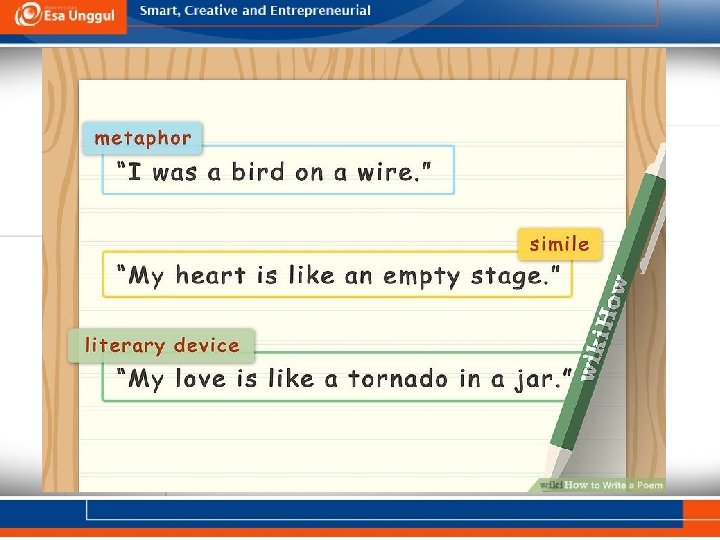 Tips #7 Include Literary Devices. Try to use literary devices throughout your poem, varying them so you do not use only metaphors or only similes in your writing. “There were nights when the wind was so cold. . Try a New Literary Device There were days when the sun Metaphor: This device compares one thing to another in a surprising way. A metaphor is a great way to add uniquewas imagery andcruel” create an interesting tone. so Example: “I was a bird on a wire, trying not to look down. ” Simile: Similes compare two things using “like” or “as. ” They might seem interchangeable with metaphors, but both create a different flow and rhythm you can play with. Example: “She was as alone as a crow in a field, ” or “My heart is It's All Coming Back to Me Now like an empty stage. ” Personification: If you personify an object or idea, you’re describing it by using human qualities or attributes. This can clear up abstract ideas or images that are hard to visualize. Example: “The wind breathed in the night. ” Alliteration: Alliteration occurs when you use words in quick succession that begin with the same letter. This is a great tool if you want to play with the way your poem sounds. Example: “Lucy let her luck linger. ” - by Celine Dion