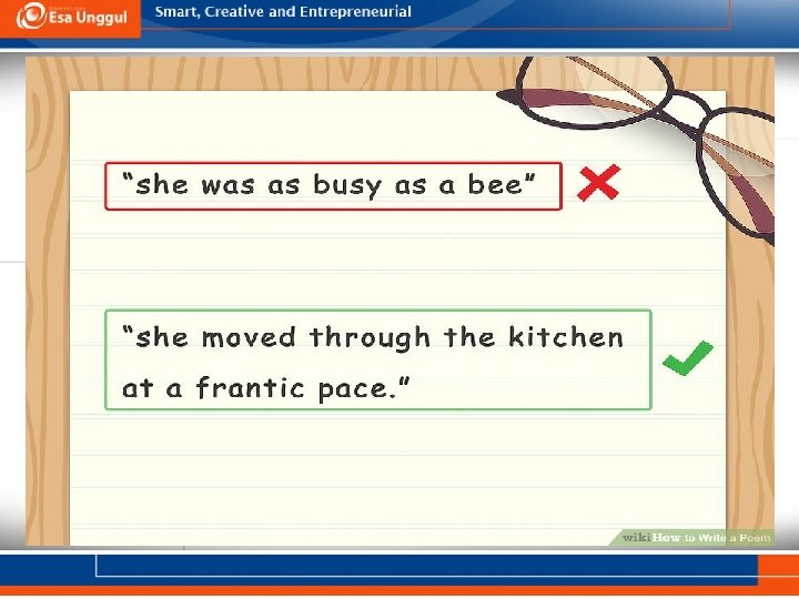 Avoid Cliche. Tips #9 • Your poetry will be much stronger if you avoid cliches, which are phrases that have become so familiar they have lost their meaning. • Go for creative descriptions and images in your poem so your reader is surprised and intrigued by your writing. If you feel a certain phrase or image will be too familiar to your reader, replace it with a more unique phrase. • For example, you may notice you have used the cliche, “she was as busy as a bee” to describe a person in your poem. You may replace this cliche with a more unique phrase, such as “her hands were always occupied” or “she moved through the kitchen at a frantic pace. ”