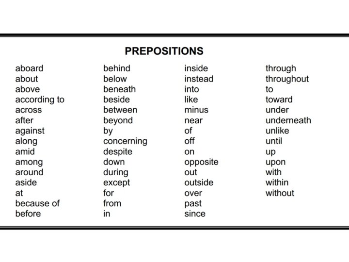 Your turn! Write a Prepositional poem: • Think of a topic: race car, hunting, walking a dog, eating lunch, etc. • Use the list of prepositions provided (see previous slide) • Visualize in your mind where something begins and how you arrive at the end. • Most/almost all phrases begin with a preposition. • Today, your poem must be 10 lines.