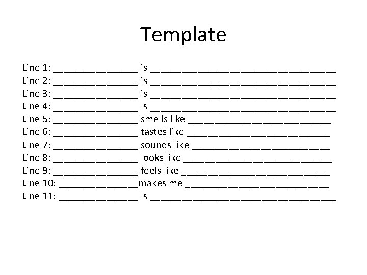 Your turn! Write a Color poem: • Pick a color: pink, red, yellow, black, etc. • Follow the template on the previous slide • Think of how your color is experienced with your senses. • Add a prepositional phrase to each line. • Ex. Red sounds like a fire engine. (Nope) • Ex. Red sounds like a fire engine racing down the street. (YES!)