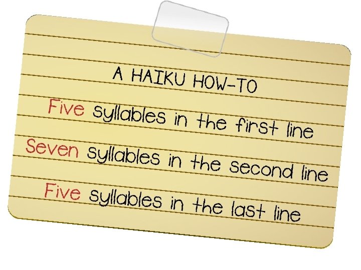 Haiku • Traditional form of Japanese poetry. • Consist of 3 lines. – The first and last lines of a Haiku have 5 syllables and the middle line has 7 syllables. • The lines rarely rhyme. • The topic of a haiku poem is usually about nature.