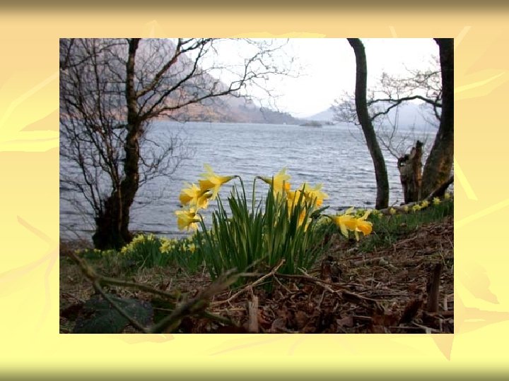 From the diary of Dorothy Wordworth, Thursday, April 15, 1802. When we were in the woods beyond Cowbarrow park we saw a few daffodils close to the water side, we fancied that the lake had floated the seeds ashore and that the little colony had so sprung up – But as we went along there were more & and yet more & at last under the boughs of the trees, we saw that there was a long belt of them along the shore, about the breadth of a country turnpike road. I never saw daffodils so beautiful they grew among the mossy stones about & about them, some rested their heads upon these stones as on a pillow for weariness & and the rest tossed & reeled & danced & seemed as if they verily laughed with the wind that blew upon them over the Lake, they looked so gay ever glancing ever changing…