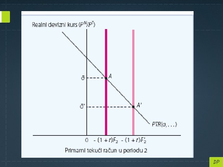 • pokazuje da, ako je devizni kurs precenjen, tako da je σ > σbar , mi bismo iz tačke A pošli na gore i ulevo duž linije PTR. To bi značilo da je PTR < -(1 + r) F 2 , te da stoga imamo deficit na tekućem računu. To znači da neto dužnik živi preko svojih mogućnosti.