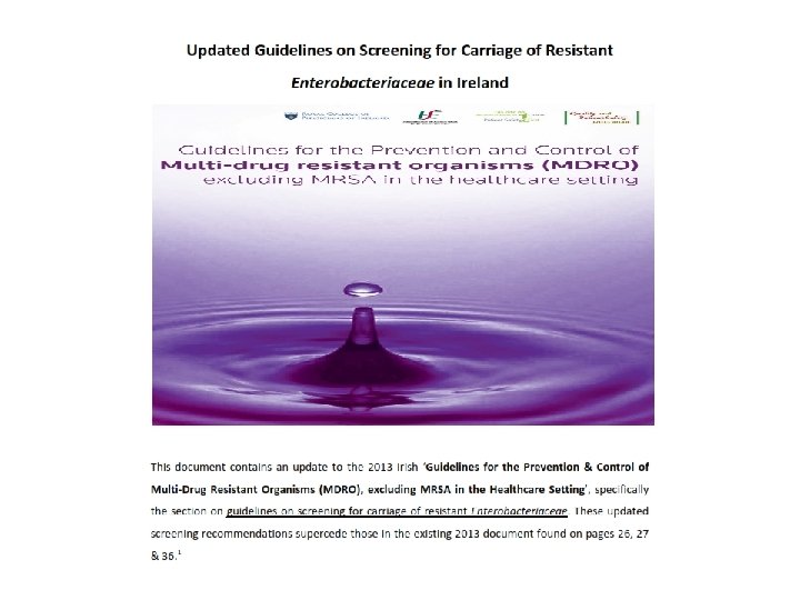 Multi-drug resistant K. pneumoniae • 1, 310 MDRKP cases reported (Q 1 2014 – Q 3 2016) from 87% of acute hospitals • 20% increase in MDRKP reported to Q 3 2016 versus same period 2015 • 2/3 reported in hospitalised patients • 59% required treatment of MDRKP infection