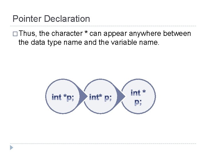 Pointer Declaration � Thus, the character * can appear anywhere between the data type name and the variable name.