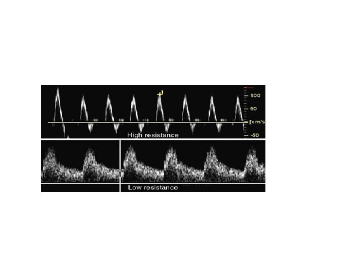 High resistance flow: Flow of a pulsatile nature. Between incident pulses, hydraulic reflections travel back up the vessel from the periphery producing flow reversals in the vascular compartment. Example arteries: ECA, subclavian, aorta, iliac, extremity arteries, fasting SMA
