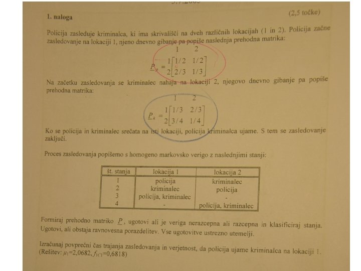 • Pri odpremi naročil v podjetju lahko pride do napak pri naslovu prejemnika, kar tvori poissonov proces s pogostostjo 5 na 100 naročil ali do napake pri vsebini paketa, kar se zgodi dvakrat na 100 naročil. • Kakšna je verjetnost, da pri 300 naročilih pride do: – Manj kot treh napak pri vsebini paketov? – Do vsaj dveh napak pri naslovih prejemnikov? – Do 10 kakršnihkoli napak? • Ob odpremi je bila storjena napaka. Kakšna je verjetnost, da so se zmotili pri vsebini paketa?
