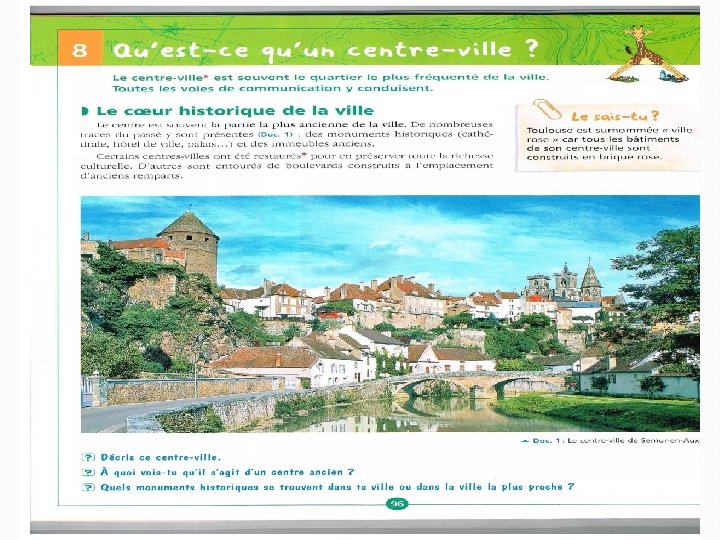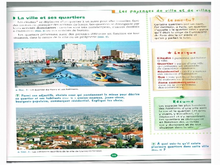 Comment est organisée une ville ? La ville est composée de rues qui forment des quartiers. Il y a toujours un centre-ville. Ce centre-ville est souvent la partie la plus ancienne de la ville. On peut y trouver des monuments historiques (Eglises, Cathédrales, …) mais aussi des commerces, des administrations (la mairie, la préfecture) et des habitations. Colle image de la ville