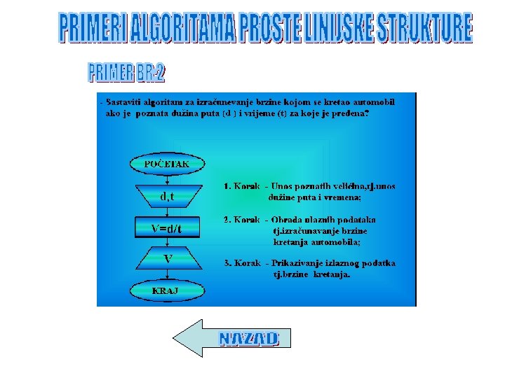 PRIMJER BR-5 Sastaviti dijagram toka i napisati program koji računa brzinu kojom se kretao biciklista ako je poznat put koji je prešao i vrijeme? REM: BRZINA CLS INPUT “s=“ , s INPUT “t=“ , t V=s / t PRINT “V=“ ; V END