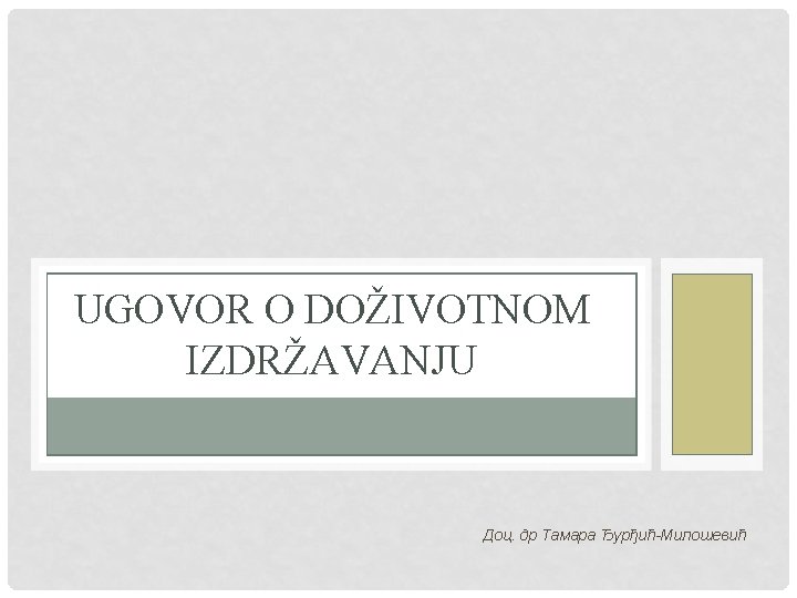 Pojam i pravne osobine Ugovor o doživotnom izdržavanju je takav ugovor kod kojeg se jedan ugovarač (davalac izdržavanja) obavezuje da do kraja života izdržava primaoca izdržavanja ili neko treće lice, a primalac izdržavanja se obavezuje da se posle njegove smrti na davaoca izdržavanja prenese svojina na stvari i dr. prava kao naknadu za pruženo izdržavanje. pravne osobine: imenovan, dvostranoobavezan, kauzalan, teretan, lični pravni posao, sa trajnim izvršenjem obaveza; aleatoran pravni posao - neizvesnost u pogledu odnosa uzajamnih činidbi o Zaključenje ugovora o doživotnom izdržavanju: • saglasnost oko predmeta ugovora (dobra koja se prenose, obaveza izdržavanja – u novcu/in natura); ako nije precizirana obaveza izdržavanja, primenjuju se dispozitivna pravila; visina izdržavanja se ugovora, ako nije ugovorena ceni se prema primaočevim potrebama, društvenom položaju i prilikama davaoca;
