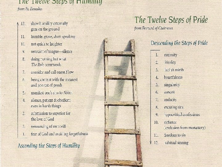 • Aj keď naplnením zákona je láska, živiteľkou lásky je pokora. Je nazývaná bránou múdrosti, základom spravodlivosti, príbytkom milosti, majsterkou čností a základom kresťanskej dokonalosti. Pokora je základom spravodlivosti, ktorá je založená na dávaní Bohu, sebe aj druhým toho, čo im patrí. Je kľúčom, ktorý otvára poklady všetkých milostí, pretože pokorný človek všetku chválu vzťahuje na Boha, a odstraňujúc z duše sebalásku, činí ju schopnou prijať milosť.