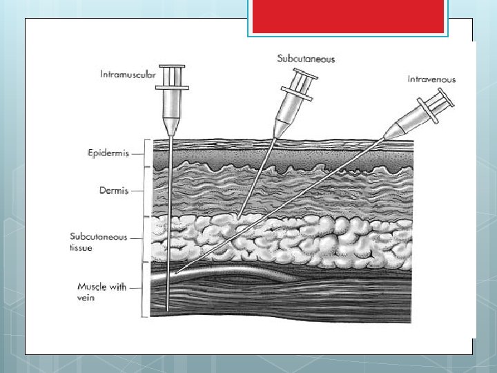Parenteral Routes Intravascular- placing a drug directly into the blood stream Intramuscular - drug injected into skeletal muscle Subcutaneous - Absorption of drugs from the subcutaneous tissues, such as fat Inhalation - Absorption through the lungs