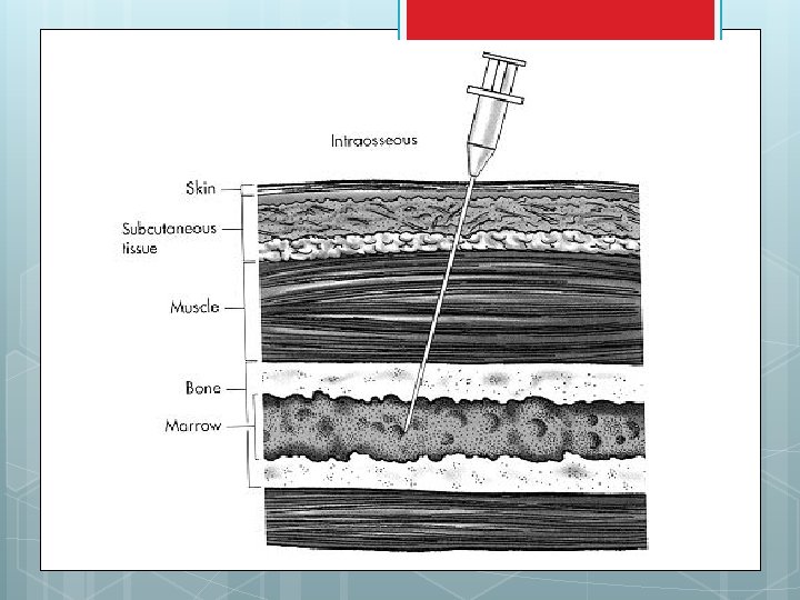 Intraosseous infusion is the process of injection directly into the marrow of the bone. The needle is injected through the bone's hard cortex and into the soft marrow interior.