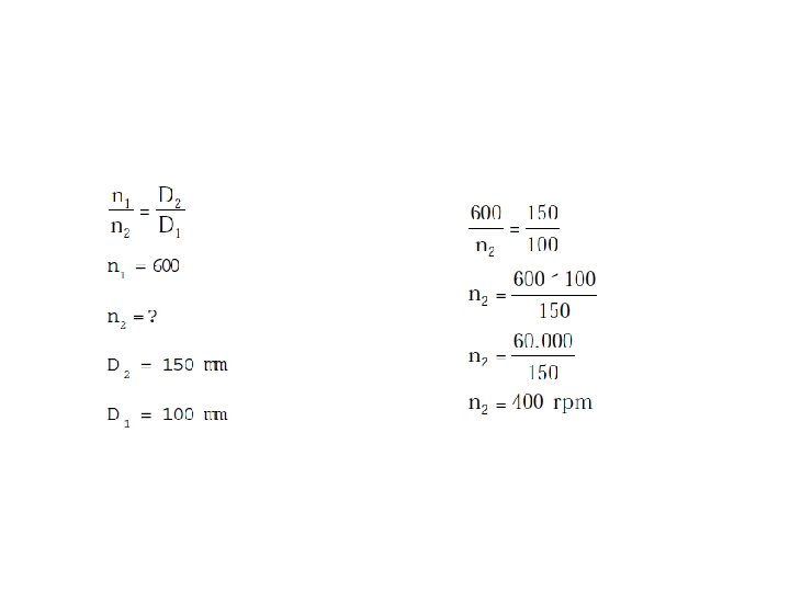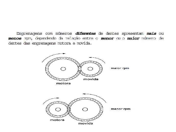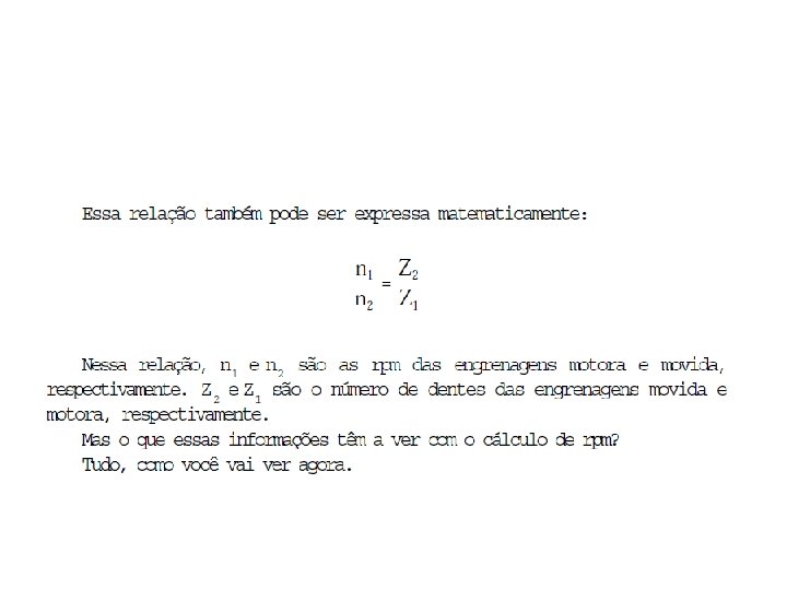 • Existe uma relação matemática que expressa esse fenômeno: • Em que n 1 e n 2 são as rpm das polias motora e movida, respectivamente, e D 2 e D 1 são os diâmetros das polias movida e motora. • Da mesma forma, quando o conjunto transmissor de velocidade é composto por engrenagens, o que faz alterar a rpm é o número de dentes. É importante saber que, em engrenagens que trabalham juntas, a distância entre os dentes é sempre igual.