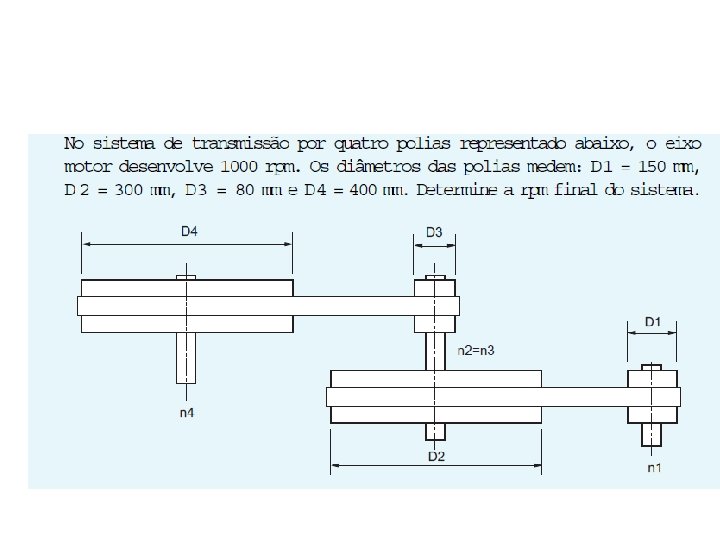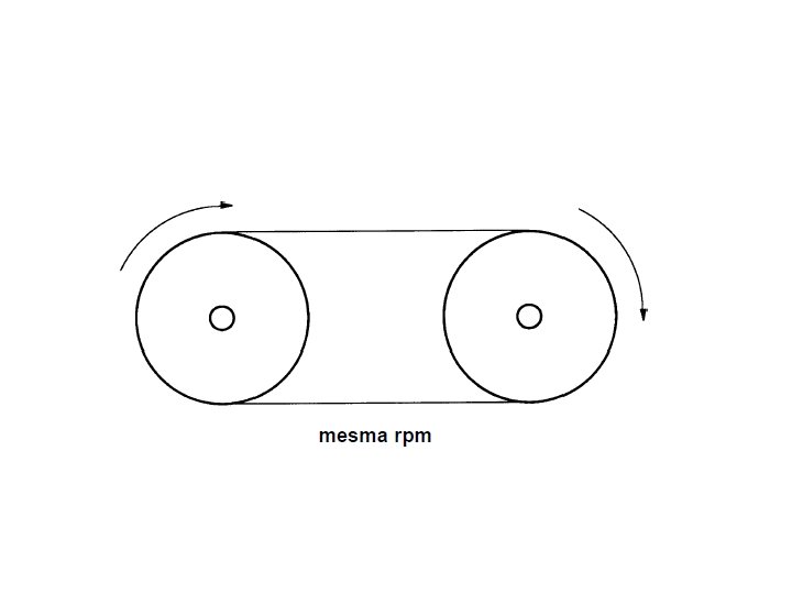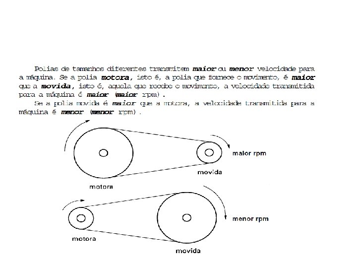 • A velocidade dos motores é dada em rpm. Esta sigla quer dizer rotação por minuto. Como o nome já diz, a rpm é o número de voltas completas que um eixo, ou uma polia, ou uma engrenagem dá em um minuto. • A velocidade fornecida por um conjunto transmissor depende da relação entre os diâmetros das polias. Polias de diâmetros iguais transmitem para a máquina a mesma velocidade (mesma rpm) fornecida pelo motor.
