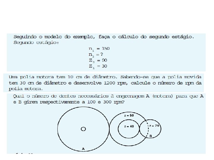 • Os conjuntos formados por polias e correias e os formados por engrenagens são responsáveis pela transmissão da velocidade do motor para a máquina. • Geralmente, os motores possuem velocidade fixa. No entanto, esses conjuntos transmissores de velocidade são capazes também de modificar a velocidade original do motor para atender às necessidades operacionais da máquina. • Assim, podemos ter um motor que gire a 600 rotações por minuto (rpm) movimentando uma máquina que necessita de apenas 60 rotações por minuto. • Isso é possível graças aos diversos tipos de combinações de polias e correias ou de engrenagens, que modificam a relação de transmissão de velocidade entre o motor e as outras partes da máquina. • Em situações de manutenção ou reforma de máquinas, o mecânico às vezes encontra máquinas sem placas que identifiquem suas rpm. Ele pode também estar diante da necessidade de repor polias ou engrenagens cujo diâmetro ou número de dentes ele desconhece, mas que são dados de fundamental importância para que se obtenha a rpm operacional original da máquina.