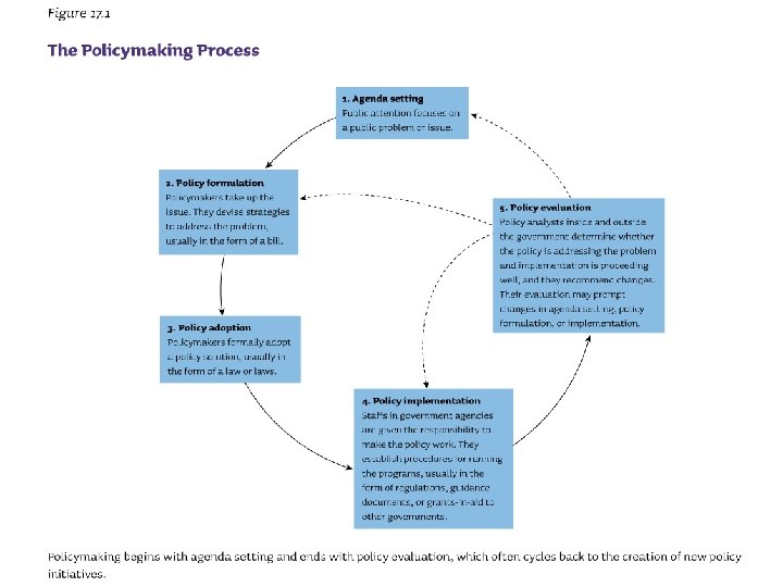 Steps of the policymaking process 1. Agenda setting: public attention focuses on a public problem or issue 2. Policy formulation: policymakers take up the issue 3. Policy adoption: policymakers formally adopt a policy solution, usually in the form of law(s) 4. Policy implementation: staffs in government agencies are given responsibility for making the policy work 5. Policy evaluation: policy analysts determine whether the policy is addressing the problem and recommend changes