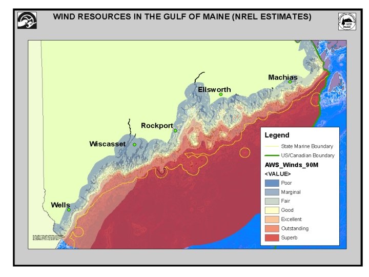 Maine Test Sites Within State Waters At least 200 Feet Deep (30 Fathoms) Average Annual Wind Speeds of >17 MPH No Obstructions Limit Ecological/Human Impacts