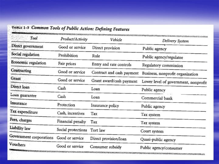 § “Structure of the delivery system” – Direct – Indirect § To private sector, other levels of government, individuals, etc. § Loan guarantees, research grants, ‘privatization’ § Water, prisons, etc.