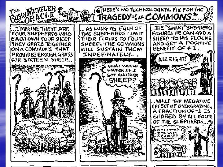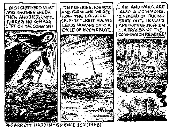 So What? Excludable Non-Excludable Market Good: cars, houses, land, oil, timber, waste absorption capacity? Open Access Regime: Oceanic fisheries, timber etc. from unprotected forests, waste absorption capacity Non-rival Tragedy of the noncommons: patented information, e. g. energy efficiency, pollution control tech. Pure Public Good: Information, most ecosystem services, e. g. climate stability, coastline protection, life support functions, etc. Non-rival congestible Toll Good, club good: Roads, parks, beaches, etc. Rival Free Rider Problem