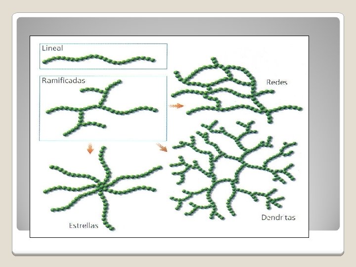 Estructura y Propiedades de los Polímeros: Según su estructura se pueden clasificar: Polímero lineal: Se forma cuando el monómero que lo origina tiene dos puntos de ataque, de modo que la polimerización ocurre unidireccionalmente y en ambos sentidos. Polímero ramificado se forma porque el monómero que lo origina posee tres o más puntos de ataque, de modo que la polimerización ocurre tridimensionalmente, en tres direcciones del espacio. - Sus formas pueden ser de: Estrella, Redes o Dendritas