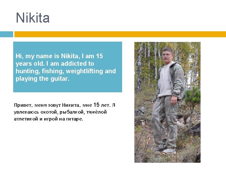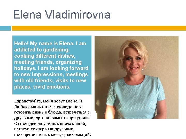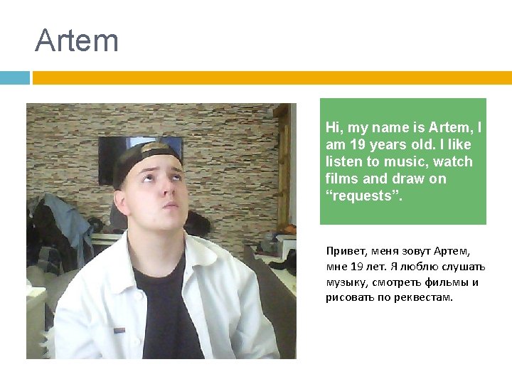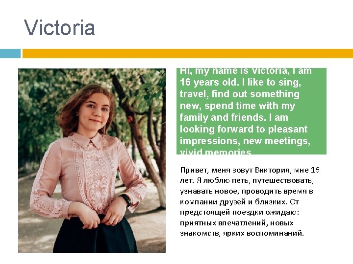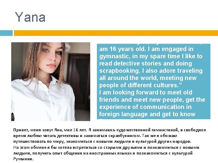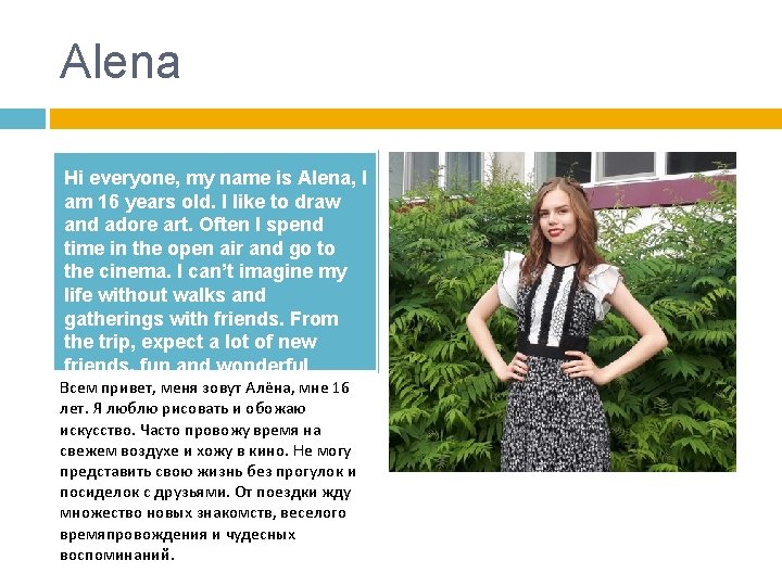 Arina Hi, my name is Arina, I’m 18 years old. I am addicted to draw, find out something new about history of Russia, learn foreign languages, spend time with my friends and travel all around the world. I am looking forward to visit the new country, meet new people. Всем привет, меня зовут Арина, мне 18 лет. Я люблю рисовать, изучать иностранные языки, проводить время в компании друзей, путешествовать по миру. Мне бы хотелось побывать в новой стране, познакомиться с новыми людьми.