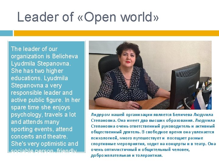 Ekaterina Hello everyone, my name is, Ekaterina, I am 17 years old. I am a very creative person, I have been engaged in various kinds of applied arts, participated in youth city government’s activities, took part in public life of the school and the city. I am looking forward to new meetings, new experience in communication with people from different countries, and I hope for the rallying of delegations. Всем привет, меня зовут Екатерина, мне 17 лет. Я очень творческий человек, занималась разными видами прикладного искусства, участвовала в деятельности молодежного правительства города, принимала участие в общественной жизни школы и города. Я жду новых знакомств, нового опыта в общении с людьми из разных стран, а также надеюсь на сплочение делегаций.