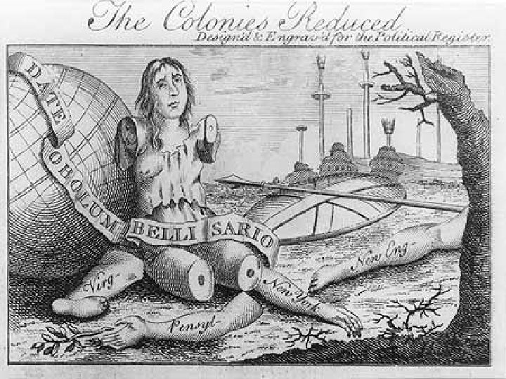 “The Colonies Reduced. ” § The cartoon depicts Mother England, surrounded by her amputated limbs—marked Virginia, Pennsylvania, New York, and New England—as she contemplates the decline of her empire. § Franklin, who was in England representing the colonists’ claims, arranged to have the image printed on cards that he distributed to members of Parliament. He hoped it would influence them to stop taxation without representation and other British acts that offended the colonists.