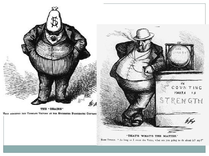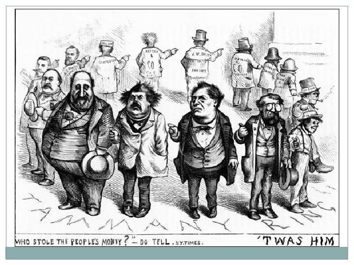 Boss Tweed- Tammany Ring �William Marcy “Boss Tweed” New York City Politician �Tammany Hall Democratic Political machine �Third Largest Landowner in New York �Stole as much as $200 million from tax payers