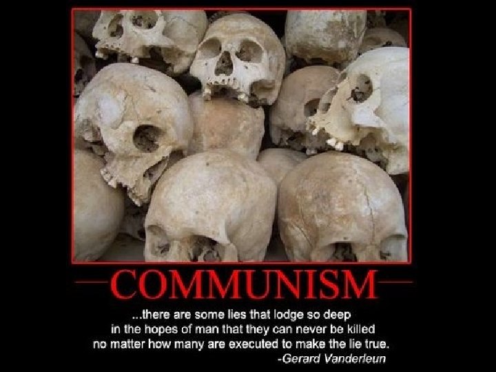 Deaths due to Communism n n Local and provincial Chinese archives indicate that the death toll was at least 45 million, and that "In most cases the party knew very well that it was starving its own people to death. ” In a secret meeting at Shanghai in 1959, Mao issued the order to procure one third of all grain from the countryside. He said: “When there is not enough to eat people starve to death. It is better to let half of the people die so that the other half can eat their fill. ”