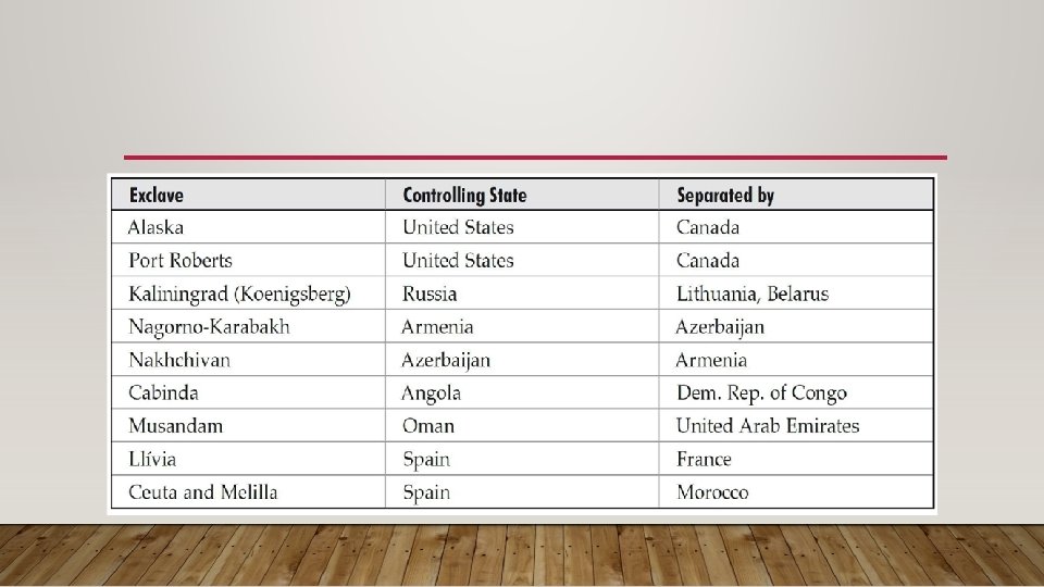 ENCLAVE AND EXCLAVE • Borderlines may be finite, but they can become quite irregular in pattern especially where the cultural borderlines become fuzzy. An enclave(飞地) is a minority culture group concentrated inside a country that is dominated by a different, larger culture group. This could be as simple as an ethnic neighborhood or a large area such as Québec(魁北克 ). • As part of the 1994 Dayton Peace Accords, several enclaves were formally established within Bosnia to separate warring Serb, Croat, and Muslim communities.