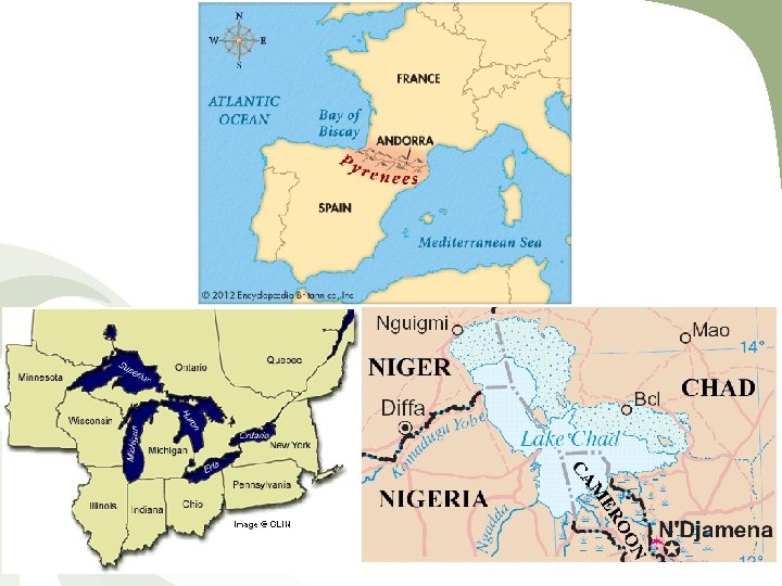 Natural Borders • Conform to physiographic features in the landscape such as rivers and mountain ranges • Examples: – Rio Grande between Texas & Mexico – Pyrenees Mts. between Spain & France – Great Lakes between U. S. & Canada – Lake Chad in Africa