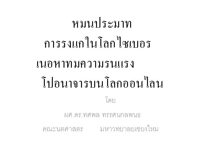 Political Hate Speech • Freedom of Expression and Hate “Hate Speech as a Political Weapons and License to Kill in Thailand Conflict” • “States have yet to reach a political agreement on how to prevent the Internet being used for promotion of Hate. ” • Political Agreement Or • Political Will