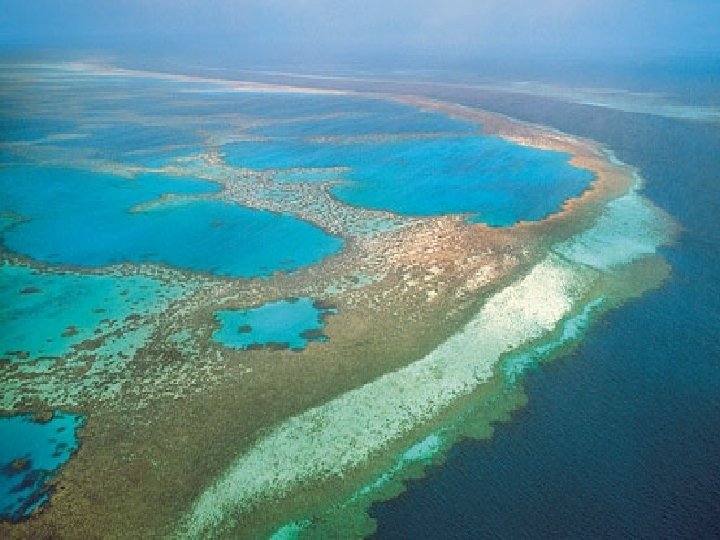 Great Barrier Reef ZWorld’s largest coral reef! ZLies off the northeast coast of Queensland--over 1, 200 miles long ZContains an amazing variety of marine life, including the world’s largest collection of coral Z 400 types of coral, 1, 500 species of fish, & 4, 000 mollusks (snails, clams, octopi, & squid) ZAlso includes rare species like the sea cow and the large green turtle