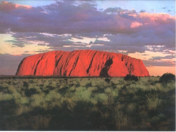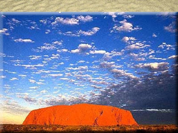 Ayers Rock Z A huge, reddish rock in the center of Australia Z Very close to the geographic center of the continent… Z It’s a monolith, which is a single, large rock sticking out of the earth Z Appears reddish because its iron content “rusts” at the surface Z Nearly 12 stories high and almost 6 miles wide!