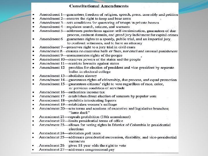 V. The Constitution and Democracy A. Founders did not intend to create a pure democracy -physical impossibility in large country -mistrust of popular passions -intent instead to create a republic with a system of representation B. Popular rule only one element of the new govt. -state legislators to elect senators -electors to chose president -two kinds of majorities- voters and states -judicial review another limitation -amendment process c. Key Principles -separation of powers -federalism -resulting powers enumerated- fed, reserved-state, concurrent-both -federalism enables one level of government to act as a check on the other
