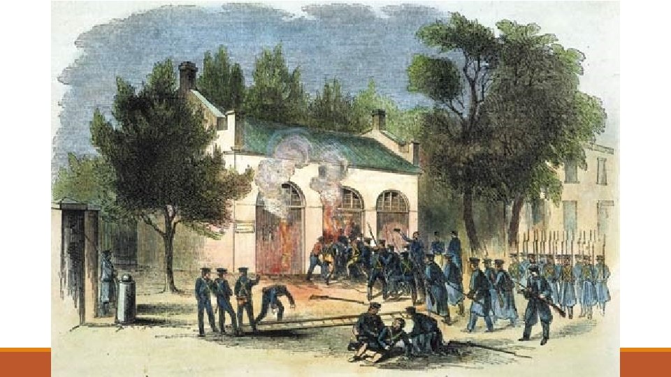 John Brown’s Raid Prior to his capture, Brown led many anti-slavery revolts throughout Kansas. ◦ In 1859 Brown set out to seize the federal arsenal in Harpers Ferry, Virginia ◦ Brown had hoped that this seizure would inspire slaves to revolt against their masters ◦ Brown’s actions failed to inspire much real support as he was looked at to radical even by most abolitionists ◦ Brown was surrounded at the arsenal, was arrested, and then was latter executed by hanging The events of John Brown’s raid of Harpers Ferry led to greater divisions between the North and South
