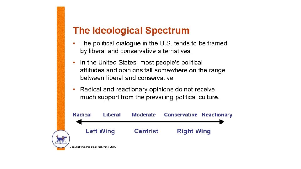 POLITICAL IDEOLOGY • Ideological Types in the United States also include: • Libertarians: People who favor freedom over both equality and order • Oppose censorship, want lower taxes, dislike gov-imposed morality • Communitarians: People who favor equality and order over freedom