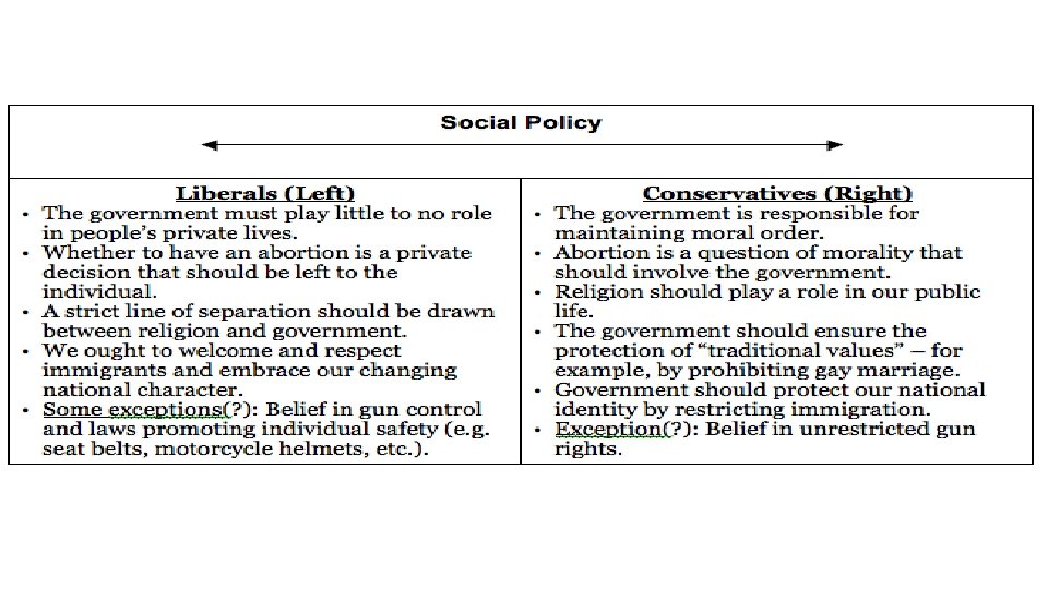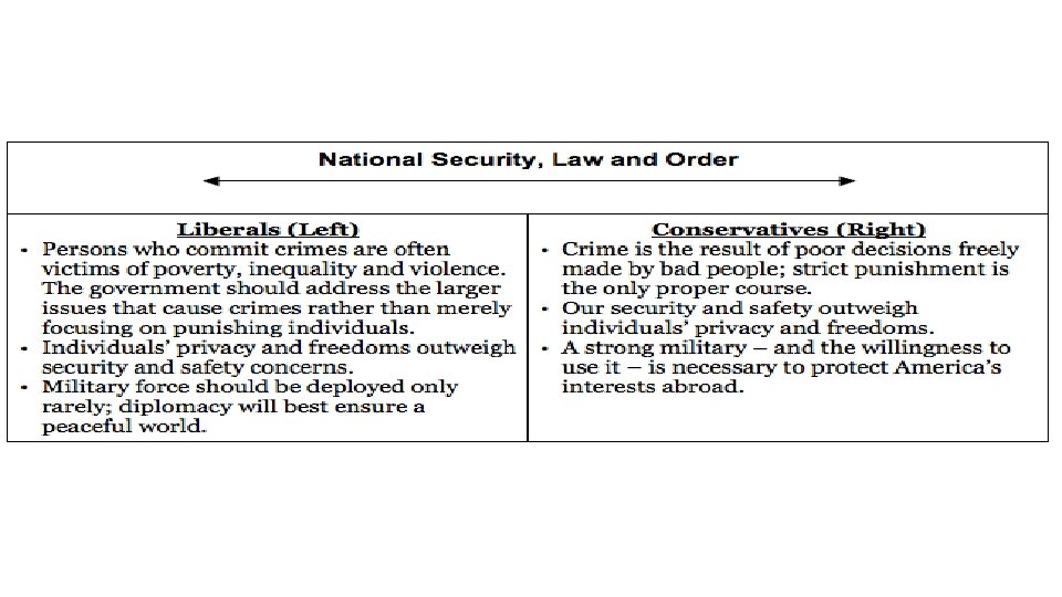 CONSERVATIVES (American) • Following tradition and having a reverence for authority. • Higher value placed on freedom than on equality when the two conflict. Restrict freedom when threatened with the loss of order • • • limit size of government (national) decrease regulation of business Pro-life support school vouchers freedom and tradition