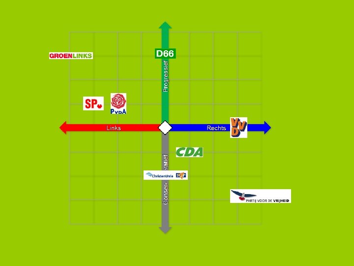 Midden (Samen) De mensen moeten het samen met de overheid doen. Sommige partijen hebben dus zowel linkse als rechtse standpunten. De overheid heeft een aanvullende rol. Hiernaast zie je een schema hoe je de belangrijkste politieke partijen van Nederland kunt indelen in progressief, rechts, conservatief en links. Niet iedereen houdt eenzelfde verdeling aan. Sommigen zien de PVV als meer rechts-conservatief als op de afbeelding hiernaast en de VVD minder conservatief. Het is dus maar net hoe je tegen de zaken aankijkt. Zie afbeelding op de volgende dia.