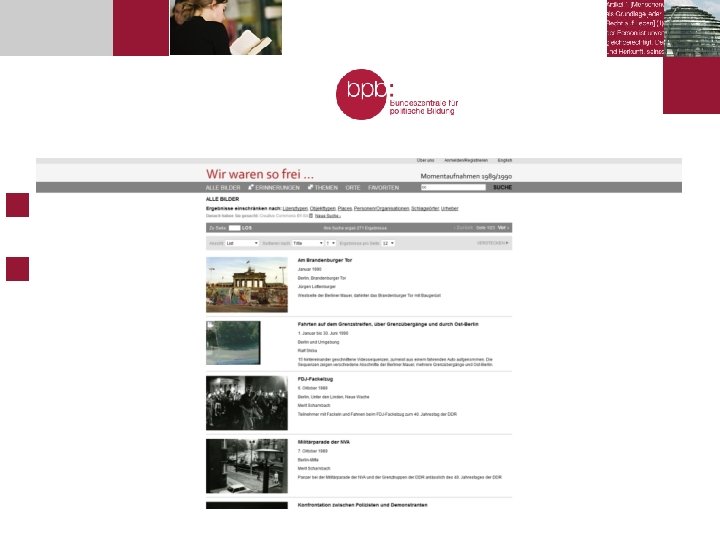 Die bpb veröffentlicht OER • OER – Material für alle (cc-by/cc-by-sa) www. bpb. de/oer • Der Wahl-O-Mat im Unterricht (cc-by-sa-nc) www. bpb. de/wahl-o-mat-im-unterricht • Geheimsache Ghettofilm – Didaktisches Material (cc-by-sa-nc) www. bpb. de/ghettofilm-didaktik • “Wir waren so frei” – 271 Fotos und Videos unter cc-by-sa www. wir-waren-so-frei. de • werkstatt. bpb. de (cc-by-sa) - Archiv: pb 21. de (cc-by) • netzdebatte. bpb. de (cc-by-sa) • Einzelne Arbeitsblätter und Unterrichtsvorschläge • ab Herbst: Didaktisches Material „Europäische Schuldenkrise“