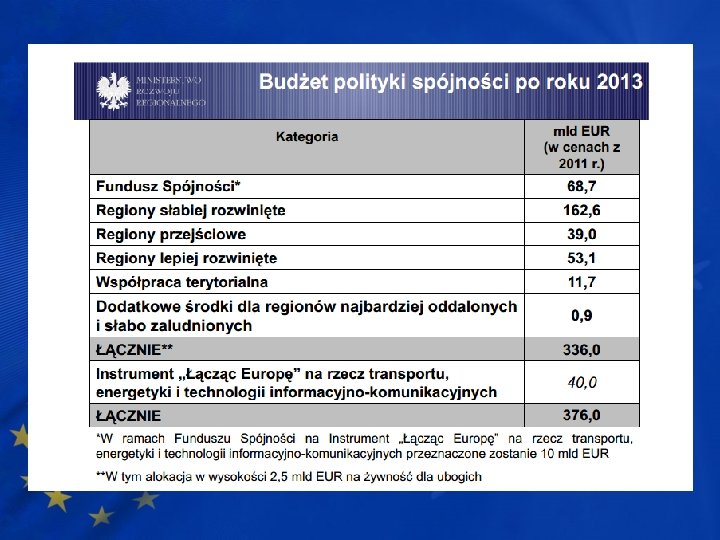 Polityka spójności 2014 -2020 • Budżet: 351, 8 mld euro • Cele: inwestycje w europejskich regionach i miastach, a także w gospodarkę realną; poza tym walka ze zmianą klimatu, uporanie się z problemem zależności energetycznej oraz ograniczenie ubóstwa i wykluczenia społecznego.