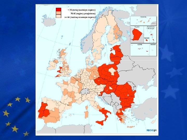 Które kraje otrzymują wsparcie? UE określa, które kraje otrzymują unijne fundusze na podstawie poziomu PKB kraju. PKB per capita < 75% średniej w UE Jeśli wszystkie regiony w kraju spełniają ten warunek, cały kraj dostaje wsparcie finansowe w postaci funduszy (np. Polska). Są też kraje, których jedynie część regionów objęta jest pomocą finansową (np. wschodnia część Niemiec).