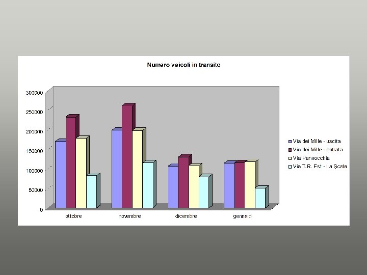I primi dati dell’attività • Il sistema è in funzione da ottobre, ecco i primi numeri dei veicoli in transito (tot. 2. 269. 753) Telecamere Ottobre Novembre Dicembre Gennaio TOT. via dei Mille uscita 170. 638 199. 734 107. 190 114. 998 592. 560 via dei Mille entrata 232. 906 261. 849 131. 105 116. 080 741. 940 Via Pannocchia 179. 018 199. 286 108. 660 118. 162 605. 126 Via T. R. Est – La Scala 83. 030 116. 130 80. 172 50. 795 330. 127
