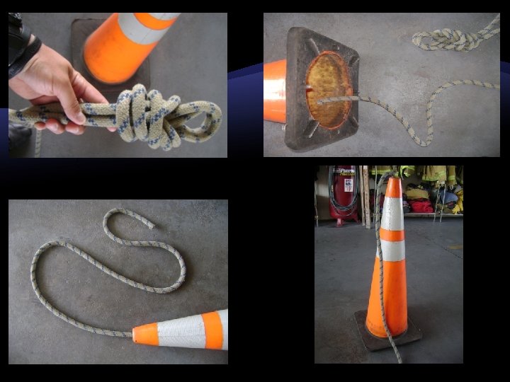 Step Two � Tie a big knot in the end of a rope (a double loop 8 works good) � Now feed the rope through the tip of the cone. � Take the other end of the rope and tie it to the end of the ladder. � You should now have a cone hanging from the tip of your ladder.