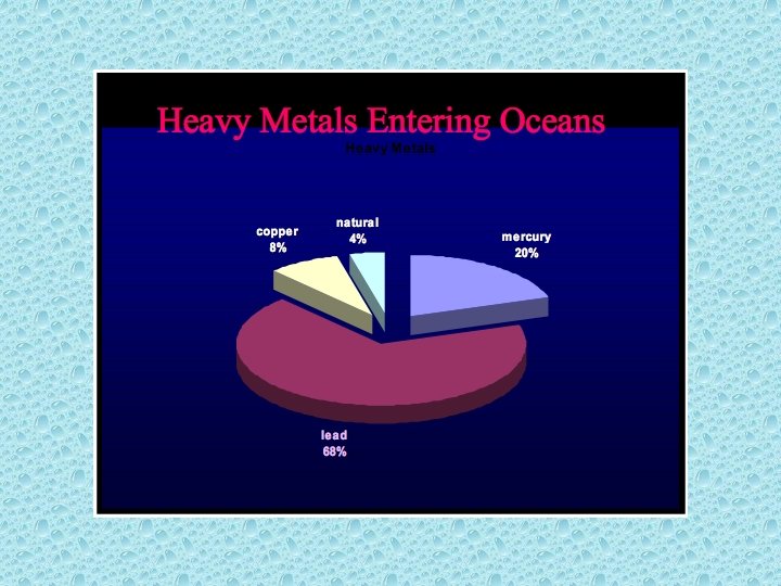Metals • Mercury, Lead and Copper have been introduced by human activity – Enter Food Chain – Toxic to organisms with neurological centers – Humans release 5 X Hg, 17 X Pb as is derived from natural sources • • Electric utilities; steel & iron manufacturing Fuel oils, additives, & combustion Incineration of urban refuse; land runoff; and dust Paint from ships, shipwrecks, and ship refuse