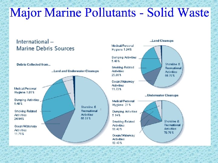 Major Marine Pollutants • 10 billion tons of ballast water – Chemicals – Invasive Species • 10 billion gallons of sewage, annually • 3. 25 million metric tons of oil annually • Millions of tons of solid waste