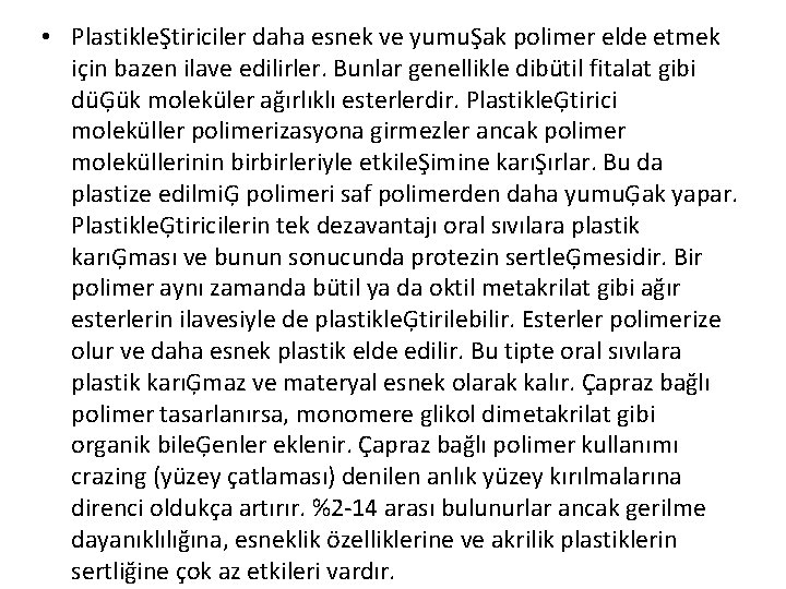 • PlastikleŞtiriciler daha esnek ve yumuŞak polimer elde etmek için bazen ilave edilirler. Bunlar genellikle dibütil fitalat gibi düĢük moleküler ağırlıklı esterlerdir. PlastikleĢtirici moleküller polimerizasyona girmezler ancak polimer moleküllerinin birbirleriyle etkileŞimine karıŞırlar. Bu da plastize edilmiĢ polimeri saf polimerden daha yumuĢak yapar. PlastikleĢtiricilerin tek dezavantajı oral sıvılara plastik karıĢması ve bunun sonucunda protezin sertleĢmesidir. Bir polimer aynı zamanda bütil ya da oktil metakrilat gibi ağır esterlerin ilavesiyle de plastikleĢtirilebilir. Esterler polimerize olur ve daha esnek plastik elde edilir. Bu tipte oral sıvılara plastik karıĢmaz ve materyal esnek olarak kalır. Çapraz bağlı polimer tasarlanırsa, monomere glikol dimetakrilat gibi organik bileĢenler eklenir. Çapraz bağlı polimer kullanımı crazing (yüzey çatlaması) denilen anlık yüzey kırılmalarına direnci oldukça artırır. %2 -14 arası bulunurlar ancak gerilme dayanıklılığına, esneklik özelliklerine ve akrilik plastiklerin sertliğine çok az etkileri vardır.