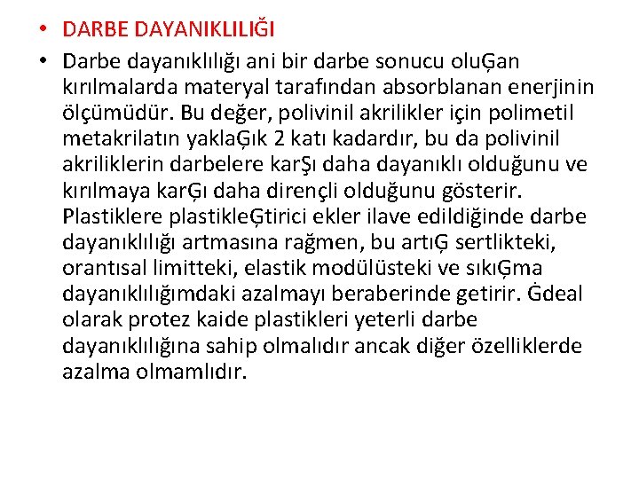 • DARBE DAYANIKLILIĞI • Darbe dayanıklılığı ani bir darbe sonucu oluĢan kırılmalarda materyal tarafından absorblanan enerjinin ölçümüdür. Bu değer, polivinil akrilikler için polimetil metakrilatın yaklaĢık 2 katı kadardır, bu da polivinil akriliklerin darbelere karŞı daha dayanıklı olduğunu ve kırılmaya karĢı daha dirençli olduğunu gösterir. Plastiklere plastikleĢtirici ekler ilave edildiğinde darbe dayanıklılığı artmasına rağmen, bu artıĢ sertlikteki, orantısal limitteki, elastik modülüsteki ve sıkıĢma dayanıklılığımdaki azalmayı beraberinde getirir. Ġdeal olarak protez kaide plastikleri yeterli darbe dayanıklılığına sahip olmalıdır ancak diğer özelliklerde azalma olmamlıdır.